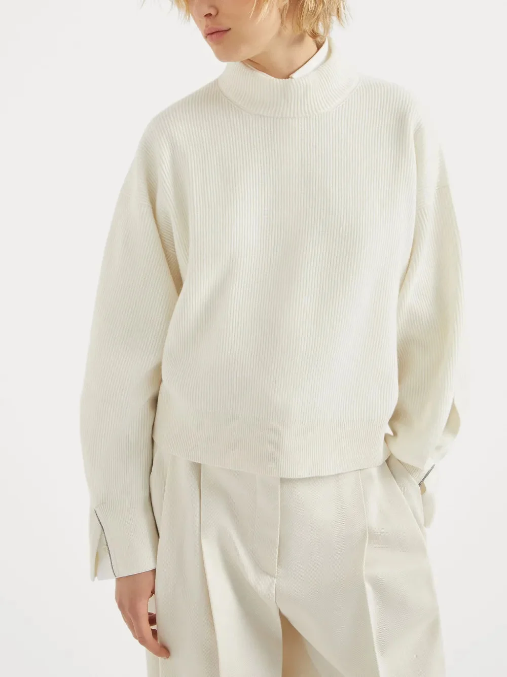 White Cashmere Ribbed knit Mock neck Long sleeves Short slit sleeves Ribbed cuffs and hem 100% Cashmere Made in Italy Style: M12191804 PANAMA