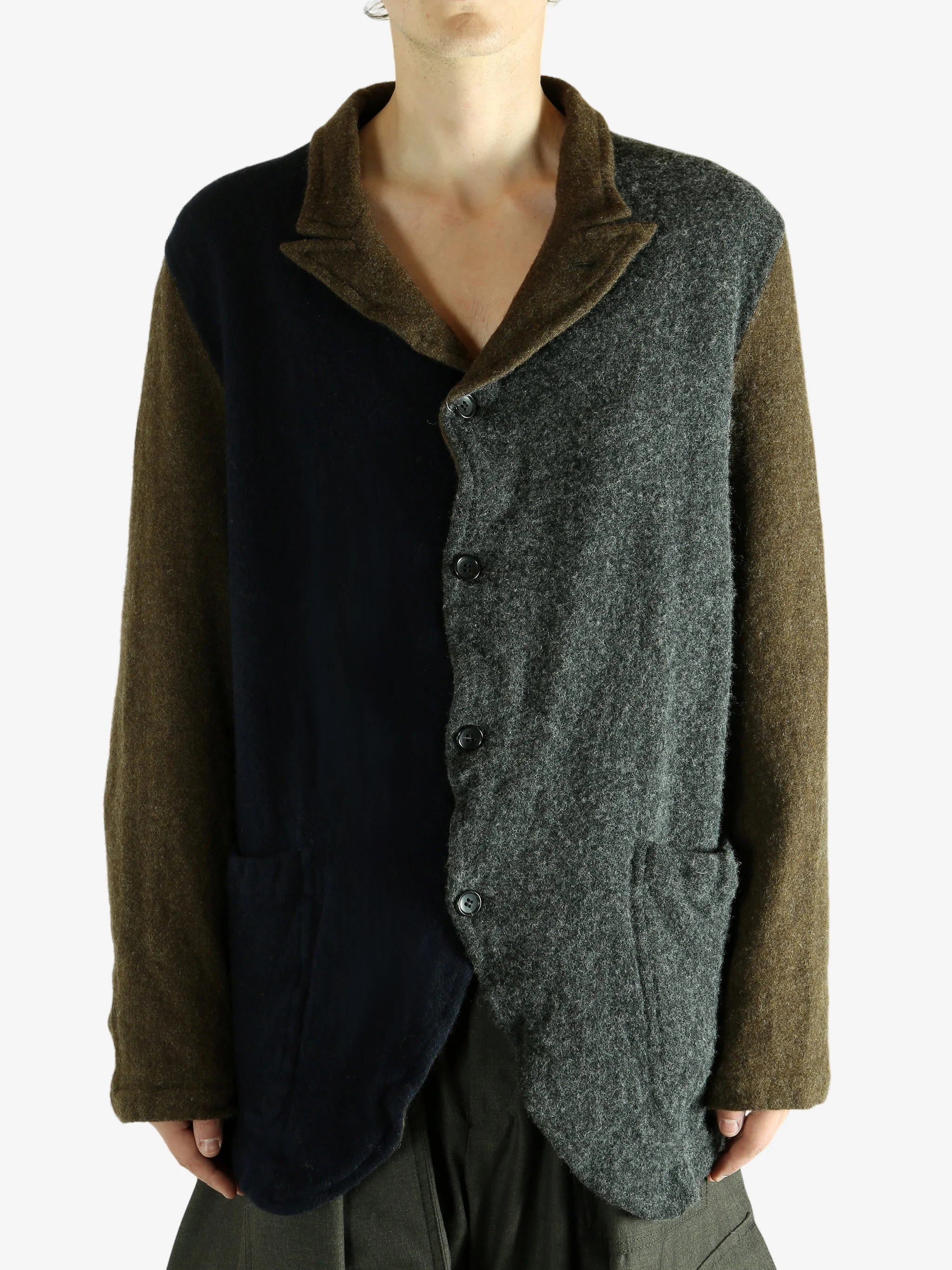 Notch lapels Button fastening Patch pockets Colour block sleeves and body Lined 90% Wool/ 10% Nylon Made in Japan Style: FP J505 051 MIX