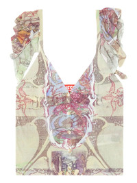 V-neckline Ruffled shoulder straps Intricate graphic design 69% Cotton/ 31% Polyimide Made in China Style: A18872 0AFBZ 7FEA