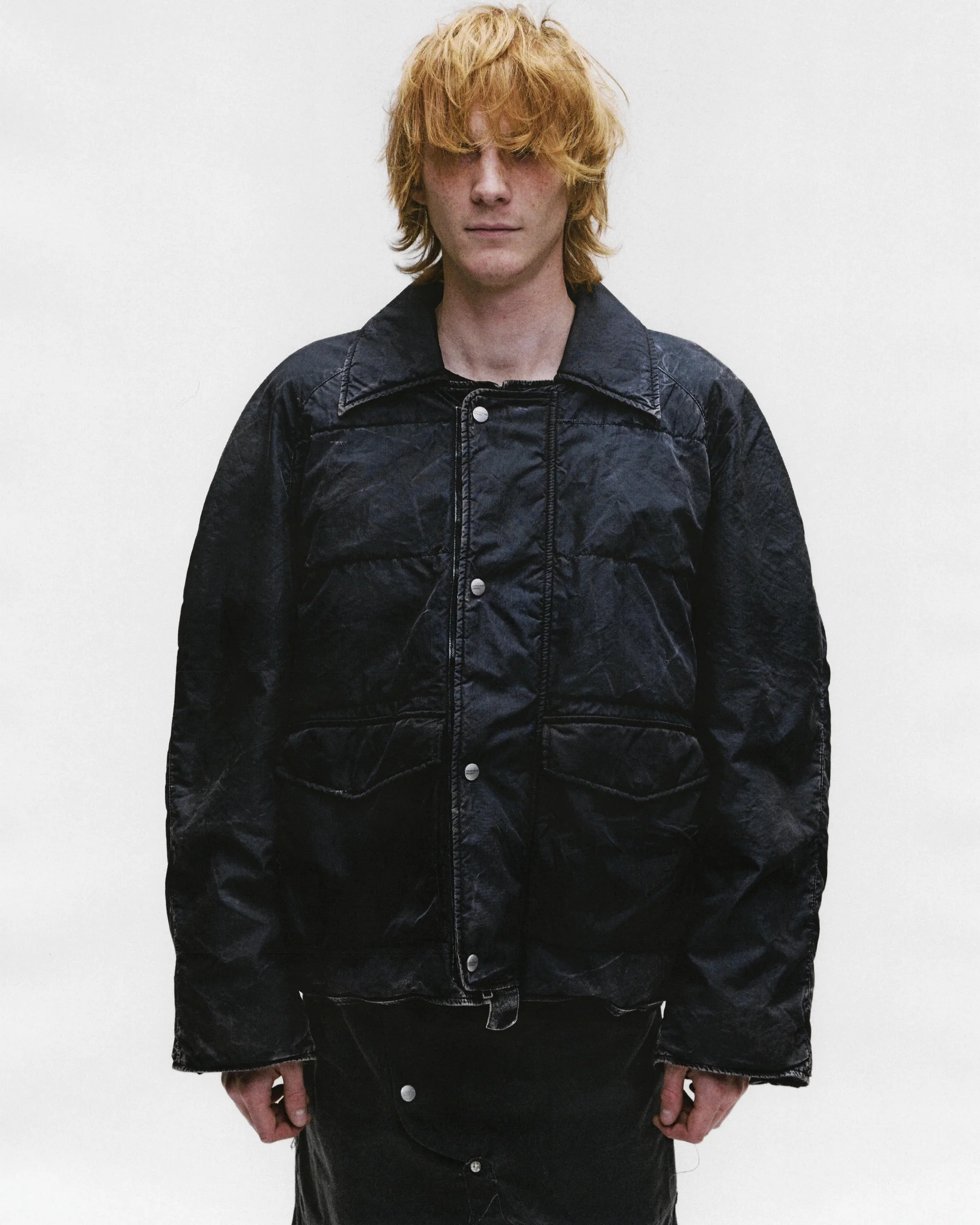 Goose down fill Spread collar Snap closure storm flap Waist hidden snap pockets Vintage wash finish 100% Cotton/ 100% Nylon Blend Filling: 100% Down Made in Italy Style: 030-560