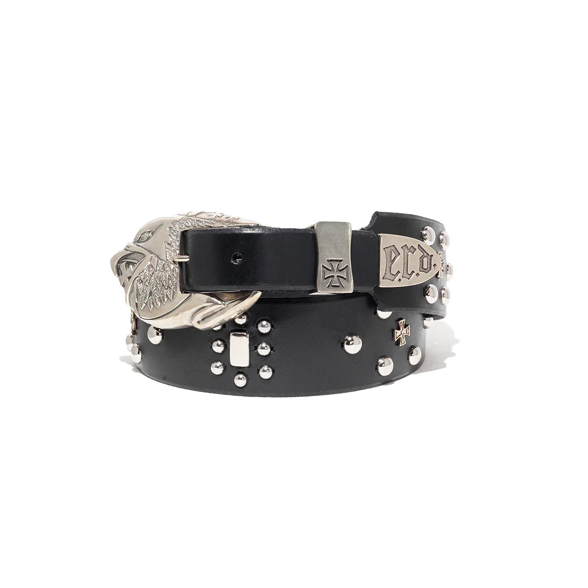 Heavy cowhide leather belt Iron cross stud detailing Hand-studded craftsmanship 50% Cow Leather/ 50% White Bronze Made in United States Style: 100 427 BLAC