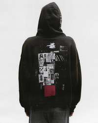 Heavyweight brushed French terry hoodie Boxy drop shoulder fit Double layer hood Kangaroo pocket Rib knit cuffs waistband All over patchwork print Monogram branded hardware Vintage wash finish Full body distressing 100% Cotton Made in Unite States Style: 020 492 SUN