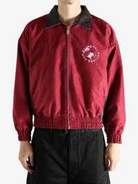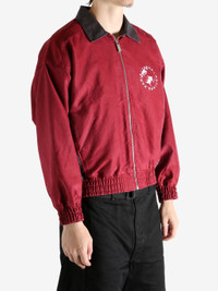 Zip front track jacket Moleskin outer material Cotton herringbone lining Spread collar design Elastic cuffs included Elastic waistband included On seam pockets at waist Printed artwork on chest Printed artwork on back 100% Cotton Made in United States Style: 030-533