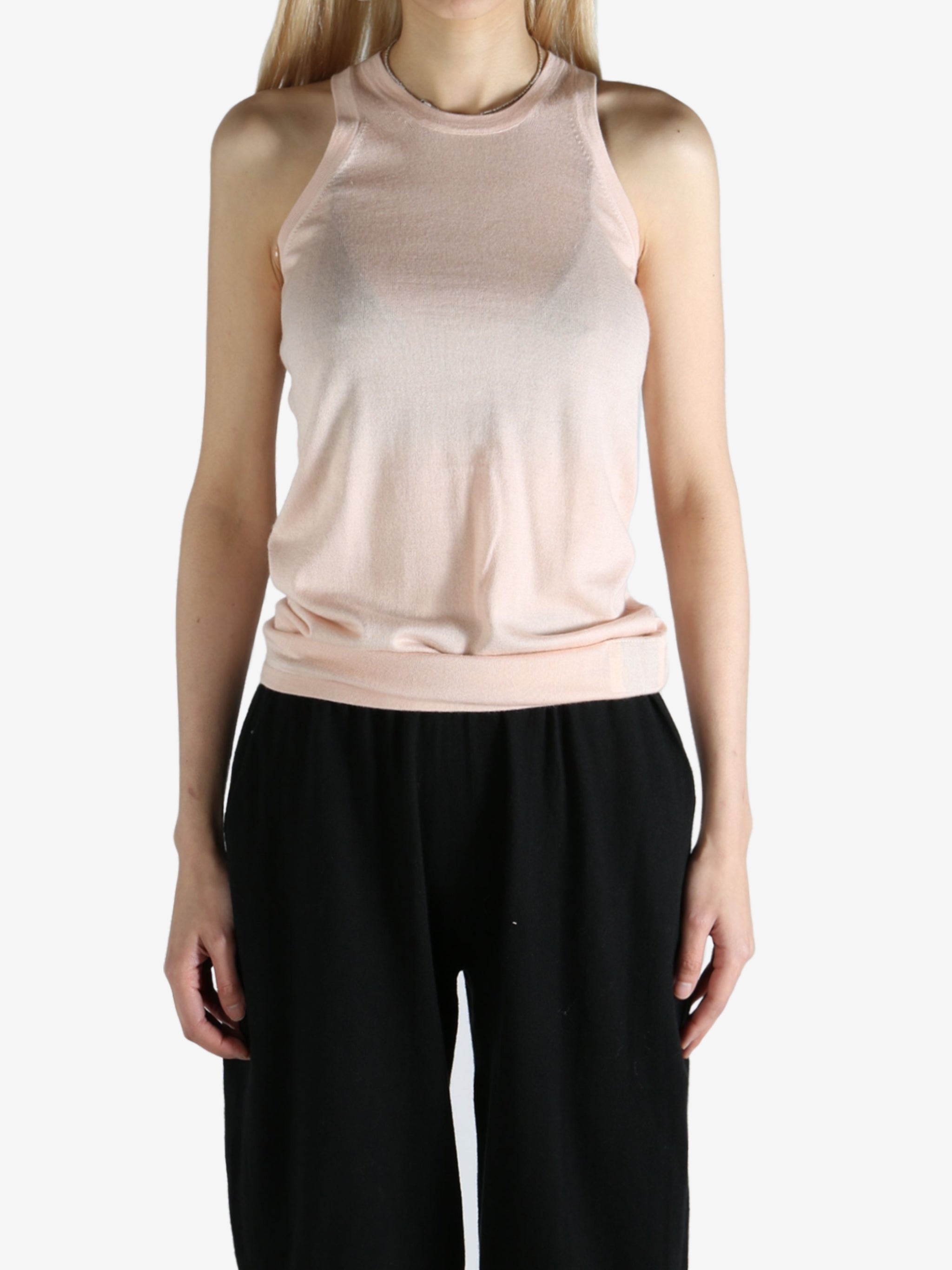 Sleeveless Slim fit Soft feel Round neck Straight hem 55% Silk knit/ 45% Cashmere Made in Mongolia Style: S25102-AS LIGHT PINK