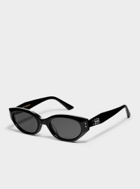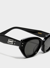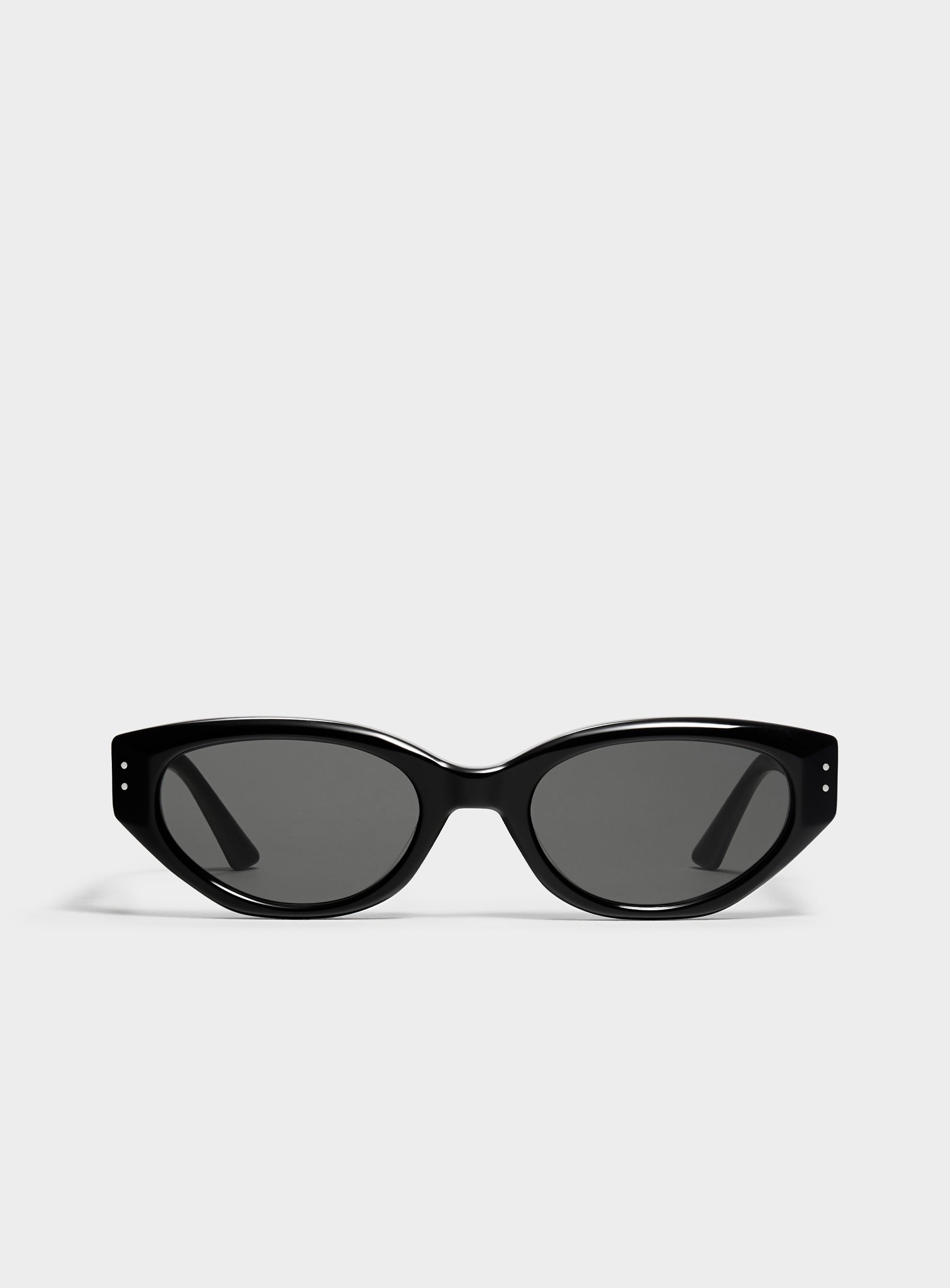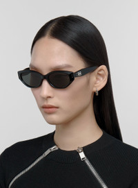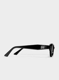 Rectangle frame Grey tinted lenses Embossed logo to the side Straight arms curved tips UV-protective lenses 100% Acetate Made in China Style: ROCOCO 01 BLAC