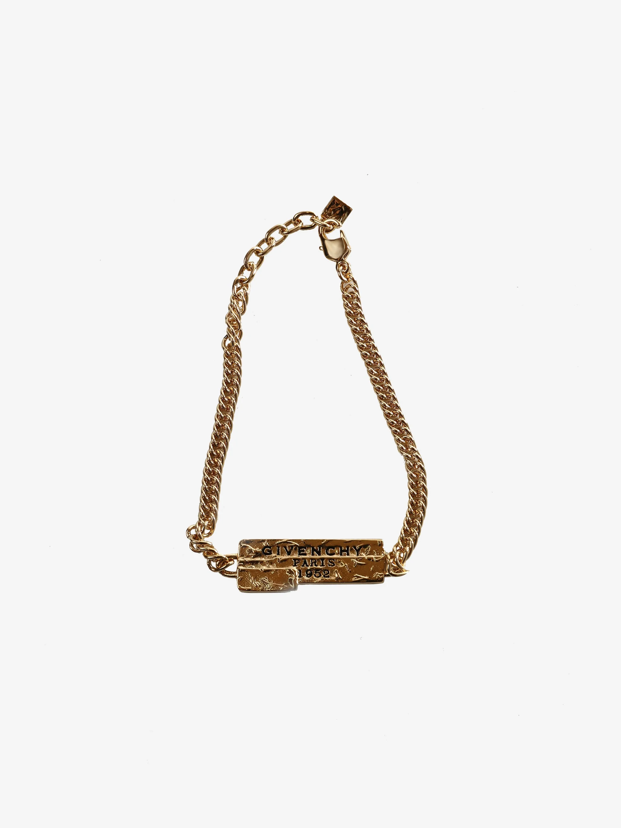 Chain bracelet in golden-finish metal. GIVENCHY Tape line. Textured metal plaque with GIVENCHY Paris 1952 in black enamel. Adjustement chain. Matching necklace, earrings, cuff and earcuff sold separately. 100% Brass Made in Italy Style: BF20JWF003966 966