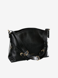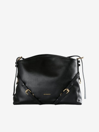 Medium shoulder bag Crafted in smooth, shiny calfskin leather Part of the Voyou line V-shaped slouchy silhouette with generous volume Adjustable strap for hand, shoulder, or crossbody wear GIVENCHY signature embossed on front and top Delicate GIVENCHY engraved metal buckles Golden-finish metal hardware One main compartment and one interior zipped pocket Suede-lined interior Outer: 100% Calf Leather Lining: 100% Calf Leather Made in Italy Style: BB5131B2AE 001