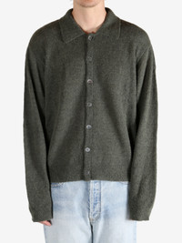 Features a peaked collar Mother of pearl buttons Deep ribbed hem Total: 55% Alpaca/ 30% Wool/ 15% Polyamid (Nylon) Made in Bangladesh Style: M4253EM