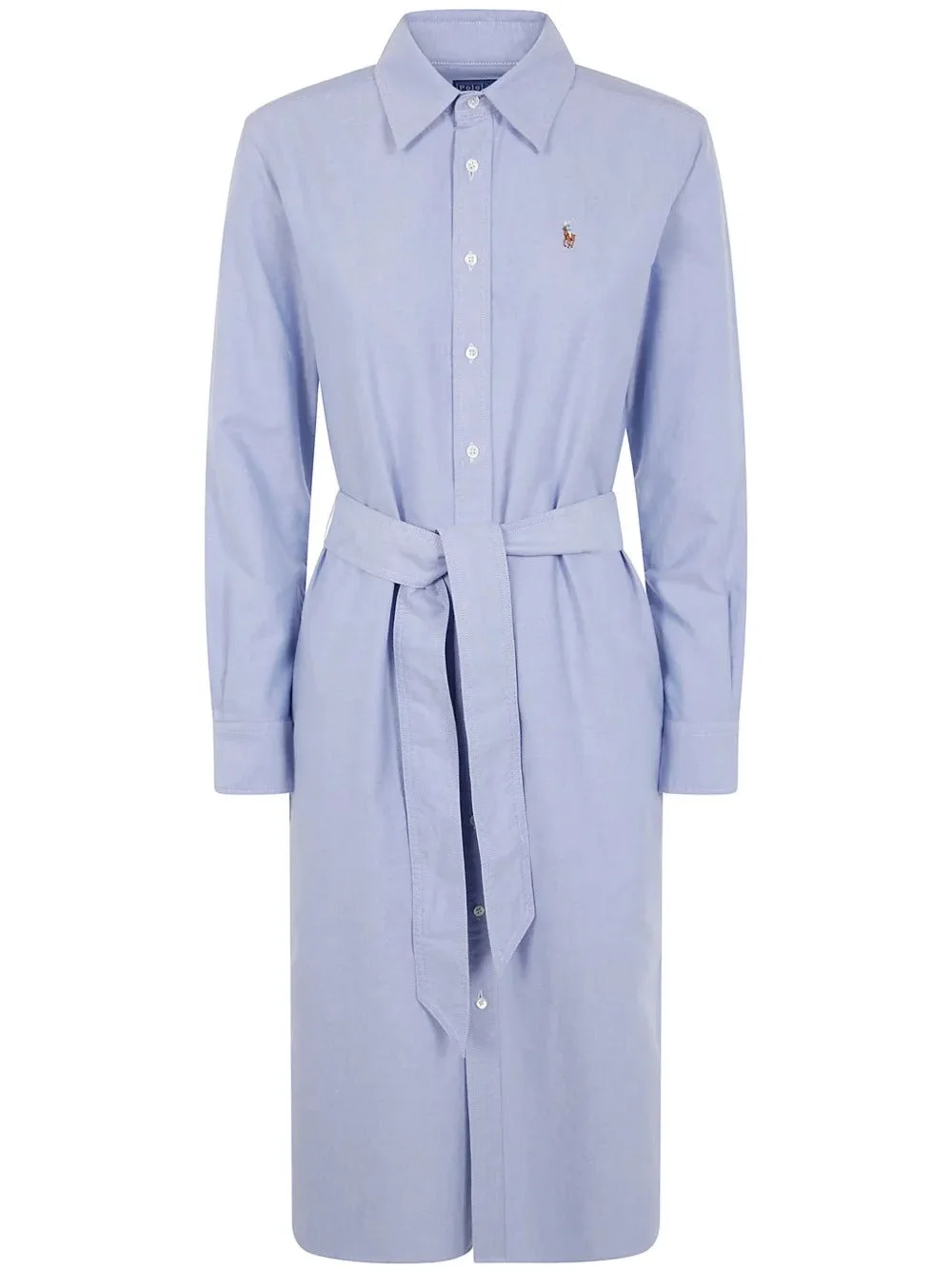 Shift style Embroidered logo at the chest Signature Polo Pony motif Pointed flat collar Front button fastening Long sleeves Buttoned cuffs Belted waist Two side slash pockets Side slits High-low hem 100% Cotton Made in Bangladesh Style: 211928804002 BLUE