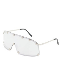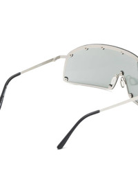 Shield style Adjustable rubber nose pads Acetate temple tips Includes leather pouch Frame: 100% Stainless steel Lenses: 100% Acetate Made in Italy Style: RG0000001 GSILV 1818
