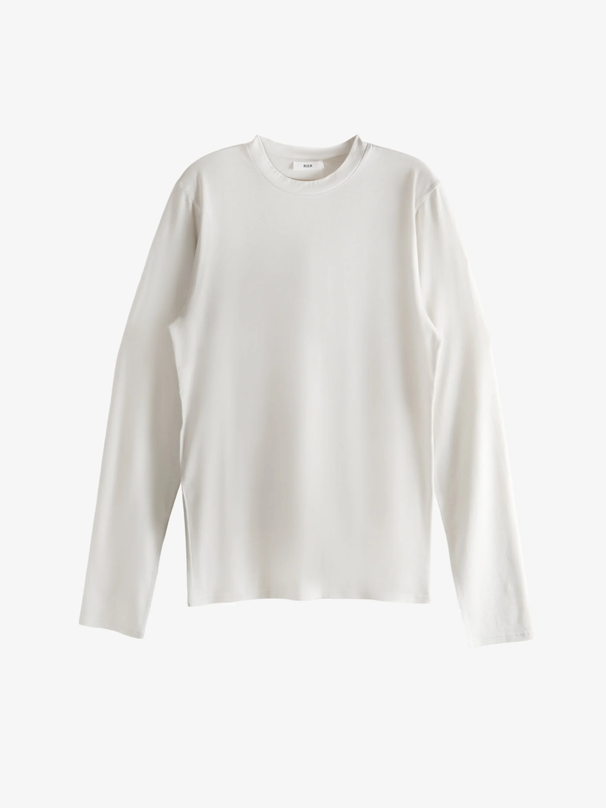 Close-fitting round neckline Extra-long sleeve over fingertips Slim silhouette base layer Comfortable lightweight style 100% Wool Made in Austria Style: TSH16 TALC JERSEY WOOL