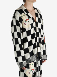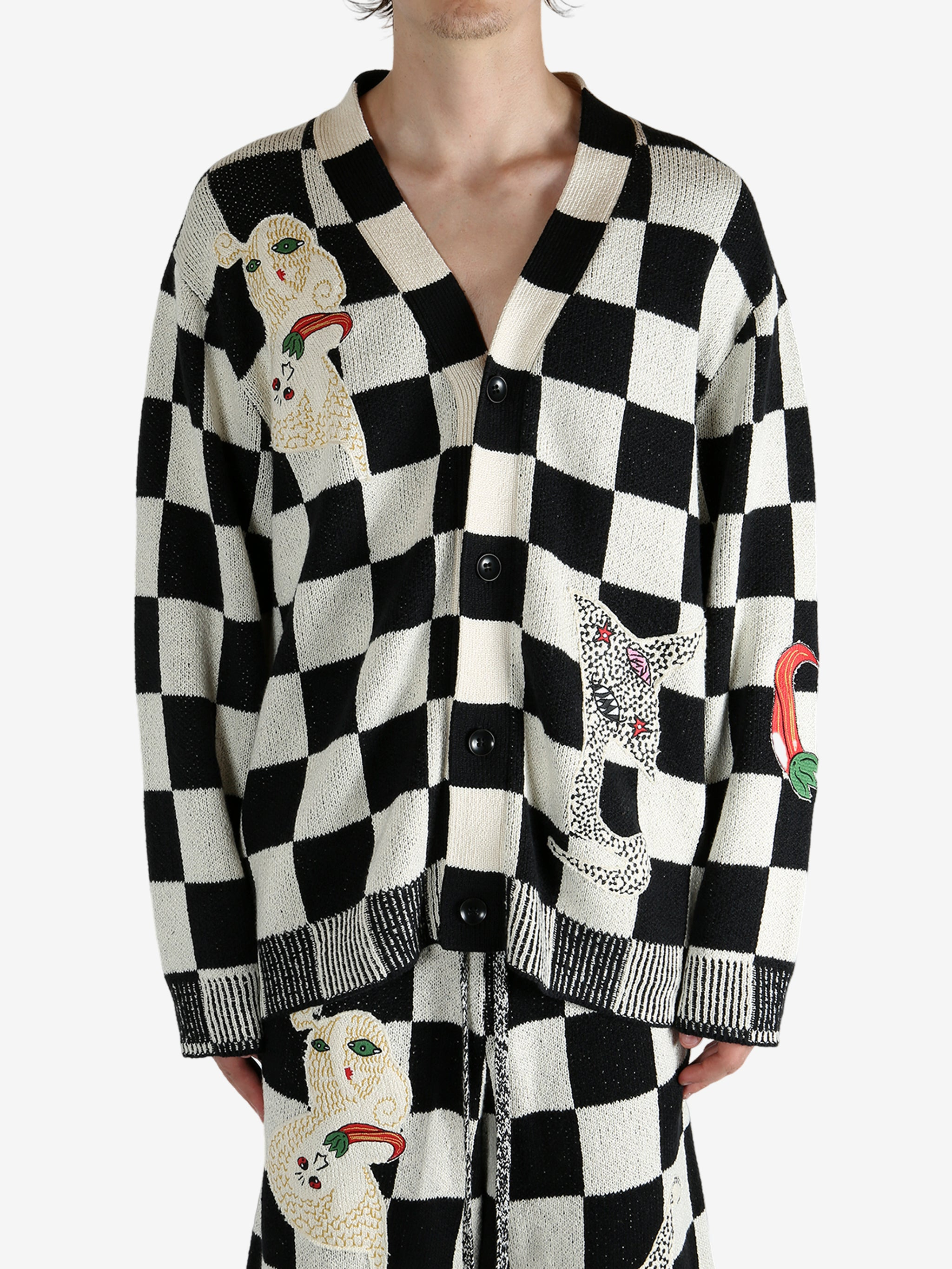 Relaxed V-neck cardigan Checkered pattern with abstract motifs 100% Cotton Made in United States Style: 250226 D433 BLAC