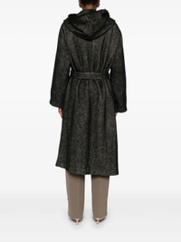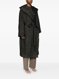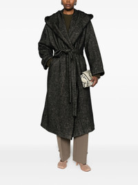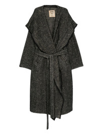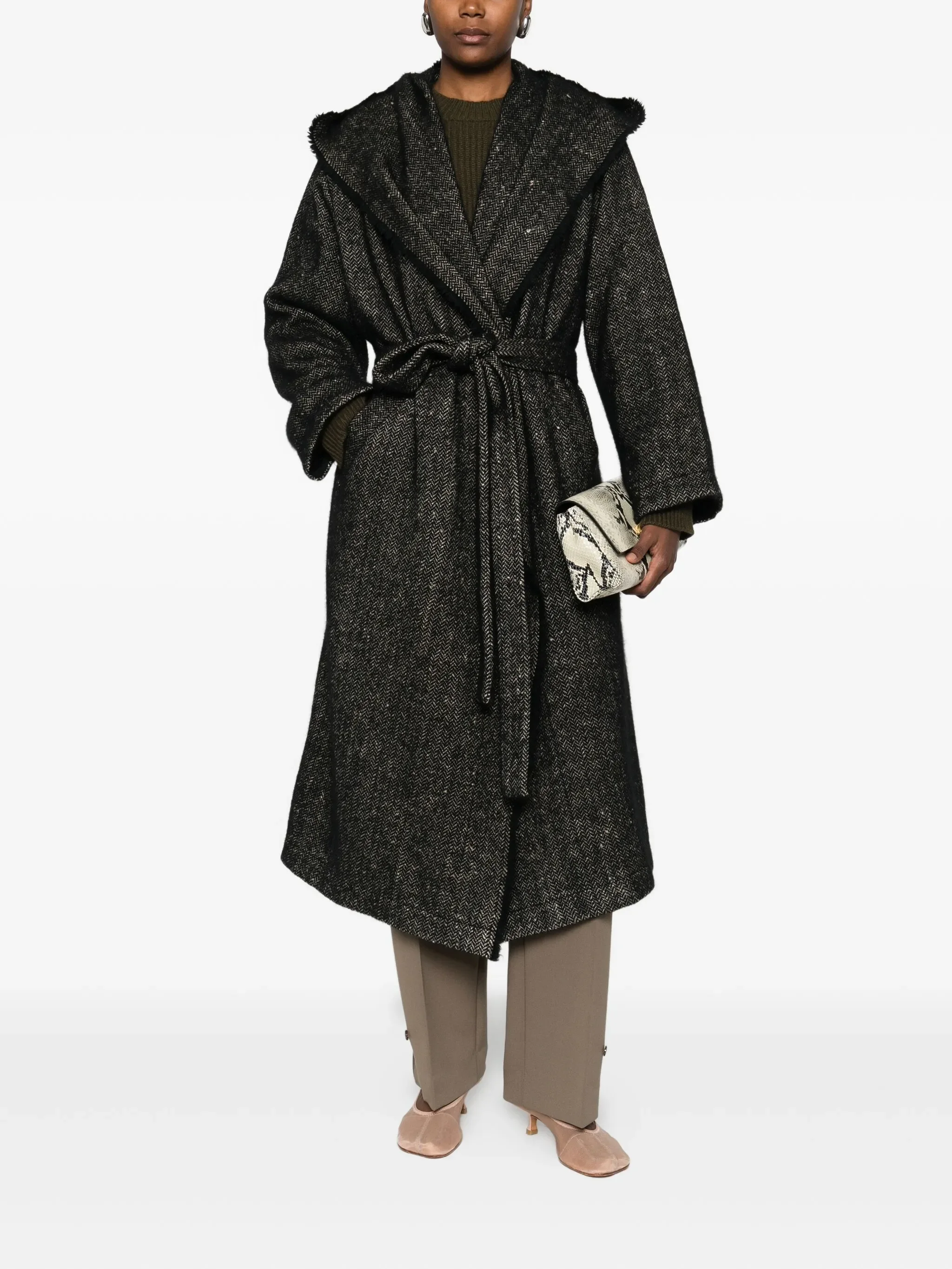 Fringed trim Belted waist Shawl collar Side welt pockets Herringbone weave 50% Silk/ 35% Angora/ 10% Polyamid/ 5% Virgin Wool Style: UW8042 UW092