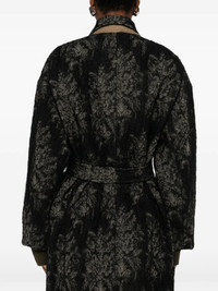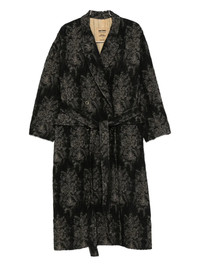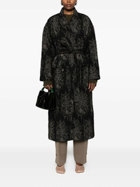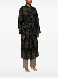 Black Floral pattern Double-breasted button fastening Belted waist Long sleeves 35% Angora/ 26% Virgin Wool/ 23% Viscose (Rayon)/ 10% Polyamide/ 6% Linen Made in Bangladesh Style: UW8058 UW092 CICERO