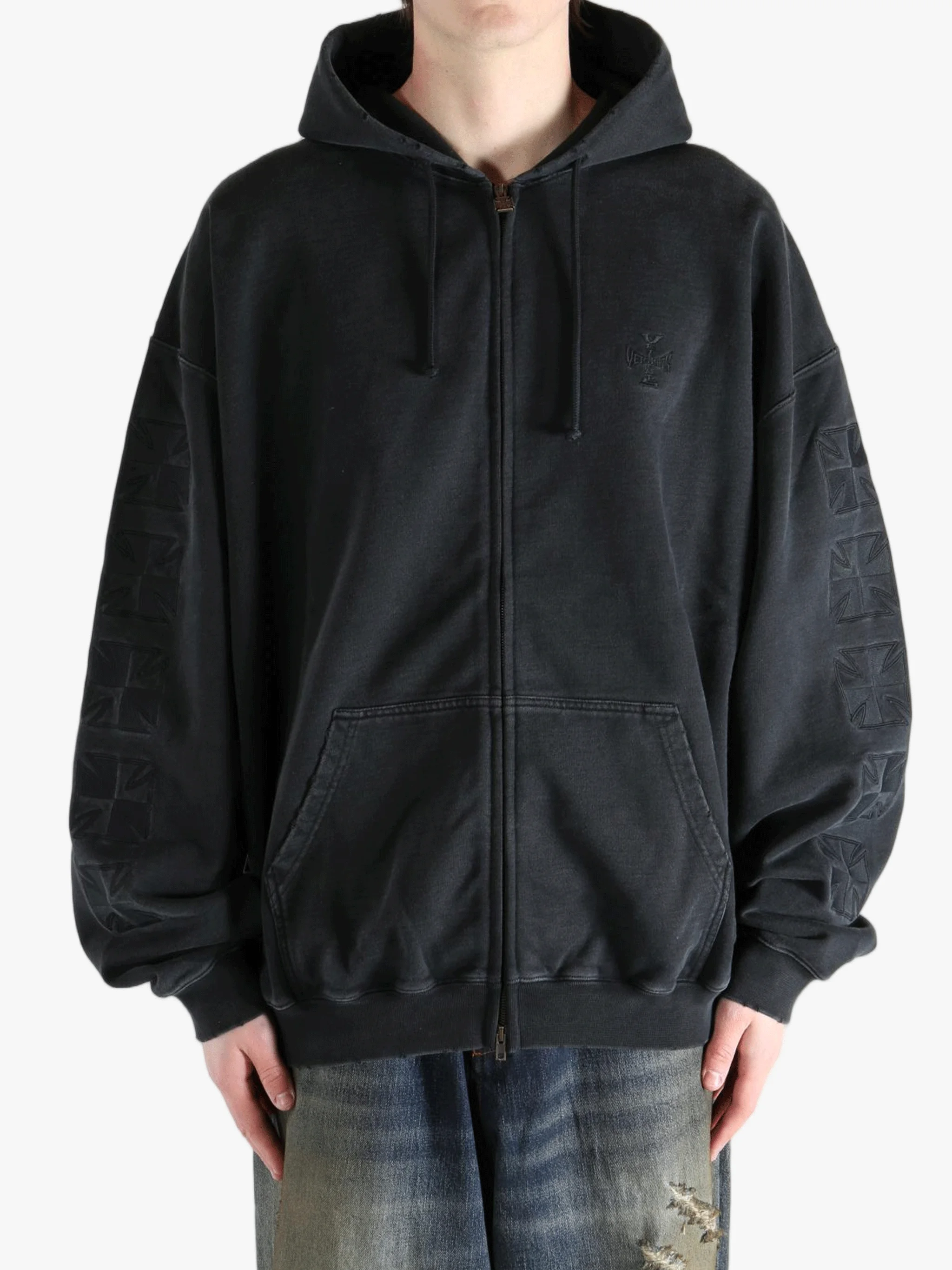 VETEMENTS - Men Embroidered Biker Cross Sleeves Zip-Up Hoodie
