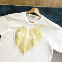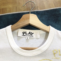 Comme Des Garcons Fades Gold Print CDG Play Tee Tag: Comme des Garcons Play size state S , measurements were armpit 17.5 inches, Shoulder width 16.5 inches, top of back collar to bottom 25 inches , (laying flat) condition: good used condition 8/10, (please refer photo) Additional: ●All Measurements were been measured flat on the floor. ●Please don't expect this item condition is 100% like new unless we have mention it. ● Please pay close attention to measurements provided. ● Do not rely on tag size as pre-worn items may have been altered, stretched or shrunk & amp; vintage sizes do not directly translate the modern sizes. The best way to ensure a correct fit is to compare our measurements with the measurements of a similar item that you know fits you well. Please enlarge the photo for cleare image ●Please do not hesitate to contact us if you have any inquiries.Its our great pleasure to have conversation with customers. ●no return & refund if its do not meet your demand, please look carefully on details given. SHIPPING & HANDLING INFORMATION : # we shipped worldwide except ISRAEL. It's safe and you will be given tracking number for all item # we shipped items within 48 hours after receiving a cleared payment on Pay Pal (except for public holidays and weekends) and please do make sure your address is correct. # Please leave us your contact phone number, as the shipping company always need the phone number to help delivering. # we do offer combine shipping to save on postage cost. Do please contact us for combine postage after final purchases for combine shipping. Shipping cost: 1) DHL EXPRESS : $36 (ETA 3-5 DAYS TO ARRIVE) (PLEASE REQUEST IF THE ITEM NEEDED TO BE EXPEDITED - ADDITIONAL COST REQUIRED;, UNLESS, WE USED REGISTERED MAIL SERVICE ) 2) REGISTERED MAIL INTERNATIONAL SERVICE : $20 (ETA 14-21 DAYS TO ARRIVE) Etc: - Do not worry about customs tax or fees. I usually declare all items as 'Gifts' & amp; declare value of items lower than original price. - All items are sold "AS IS" so please be sure to read the entire descriptions and look at all pictures. - Any questions and more details, please do not hesitate to contact me. Thanks for your visit
