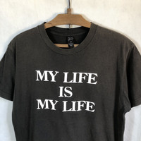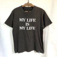 Fpar “My Life Is My Life” Script Tshirt Tag: Fpar Size stated 3 measurements: armpit 21 inches, top of back collar to bottom 27.5 inches Shoulder width 19 inches condition: good condition 8/10, (please zoom extra photo given) main colour: faded black Additional: ●All Measurements were been measured flat on the floor. ●Please don't expect this item condition is 100% like new unless we have mention it. ● Please pay close attention to measurements provided. ● Do not rely on tag size as pre-worn items may have been altered, stretched or shrunk & amp; vintage sizes do not directly translate the modern sizes. ● The best way to ensure a correct fit is to compare our measurements with the measurements of a similar item that you know fits you well. Please enlarge the photo for clearer image. SHIPPING & HANDLING INFORMATION : # we shipped worldwide except ISRAEL. It's safe and you will be given tracking number for all item # we shipped items within 48 hours after receiving a cleared payment on Pay Pal (except for public holidays and weekends) and please do make sure your address is correct. # Please leave us your contact phone number, as the shipping company always need the phone number to help delivering. # we do offer combine shipping to save on postage cost. Do please contact us for combine postage after final purchases for combine shipping. Shipping cost: 1) DHL EXPRESS : $36 (ETA 3-5 DAYS TO ARRIVE) (PLEASE REQUEST IF THE ITEM NEEDED TO BE EXPEDITED - ADDITIONAL COST REQUIRED;, UNLESS, WE USED REGISTERED MAIL SERVICE ) 2) REGISTERED MAIL INTERNATIONAL SERVICE : $20 (ETA 14-21 DAYS TO ARRIVE) Etc: - Do not worry about customs tax or fees. I usually declare all items as 'Gifts' & amp; declare value of items lower than original price. - All items are sold "AS IS" so please be sure to read the entire descriptions and look at all pictures. - Please do not hesitate to contact us if you have any inquiries.Its our great pleasure to have conversation with customers. - No return & refund if its do not meet your demand, please look carefully on details given. Thank you very much for your visit