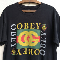 Obey 1989 Gucci Inspired Tee Tag: Obey measurements: armpit 21.5 inches, top of back collar to bottom 30.5 inches Shoulder width 20 inches condition: good condition 8/10 , no hole, ripped or stain , just 2 small bleach spot (please zoom extra photo given) main colour: black slightly natural faded Additional: ●All Measurements were been measured flat on the floor. ●Please don't expect this item condition is 100% like new unless we have mention it. ●Please do not hesitate to contact us if you have any inquiries.Its our great pleasure to have conversation with customers. ●no return & refund if its do not meet your demand, please look carefully on details given. SHIPPING & HANDLING INFORMATION : # we shipped worldwide except ISRAEL. It's safe and you will be given tracking number for all item # we shipped items within 48 hours after receiving a cleared payment on Pay Pal (except for public holidays and weekends) and please do make sure your address is correct. # Please leave us your contact phone number, as the shipping company always need the phone number to help delivering. # we do offer combine shipping to save on postage cost. Do please contact us for combine postage after final purchases for combine shipping. Shipping cost: 1) DHL EXPRESS : $36 (ETA 3-5 DAYS TO ARRIVE) (PLEASE REQUEST IF THE ITEM NEEDED TO BE EXPEDITED - ADDITIONAL COST REQUIRED;, UNLESS, WE USED REGISTERED MAIL SERVICE ) 2) REGISTERED MAIL INTERNATIONAL SERVICE : $15 (ETA 14-21 DAYS TO ARRIVE) Thank you very much for your visit