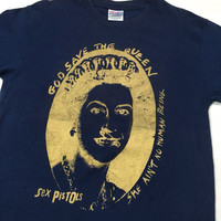 Rare! Vintage 90s Sex Pistols Jamie Reid God Save The Queen Gold Print Tee Tag: Hanes Size stated Medium measurements: armpit 19 inches, top of back collar to bottom 29 inches Shoulder width 18 inches condition: good condition 9/10, no hole, ripped or stain , (please zoom extra photo given) main colour: navy with golden print Additional: ●All Measurements were been measured flat on the floor. ●Please don't expect this item condition is 100% like new unless we have mention it. ●Please do not hesitate to contact us if you have any inquiries.Its our great pleasure to have conversation with customers. ●no return & refund if its do not meet your demand, please look carefully on details given. SHIPPING & HANDLING INFORMATION : # we shipped worldwide except ISRAEL. It's safe and you will be given tracking number for all item # we shipped items within 48 hours after receiving a cleared payment on Pay Pal (except for public holidays and weekends) and please do make sure your address is correct. # Please leave us your contact phone number, as the shipping company always need the phone number to help delivering. # we do offer combine shipping to save on postage cost. Do please contact us for combine postage after final purchases for combine shipping. Shipping cost: 1) DHL EXPRESS : $36 (ETA 3-5 DAYS TO ARRIVE) (PLEASE REQUEST IF THE ITEM NEEDED TO BE EXPEDITED - ADDITIONAL COST REQUIRED;, UNLESS, WE USED REGISTERED MAIL SERVICE ) 2) REGISTERED MAIL INTERNATIONAL SERVICE : $15 (ETA 14-21 DAYS TO ARRIVE) Thank you very much for your visit