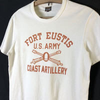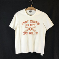 Fort Eustis Us Army Toys McCoy Spellout Tshirt Tag: Toys Mccoy/ Real Mccoy Size stated 38/M measurements: armpit 19.5 inches, top of back collar to bottom 27 inches Shoulder width 18 inches condition: good condition 8/10, (please zoom extra photo given) main colour: white Additional: ●All Measurements were been measured flat on the floor. ●Please don't expect this item condition is 100% like new unless we have mention it. ● Please pay close attention to measurements provided. ● Do not rely on tag size as pre-worn items may have been altered, stretched or shrunk & amp; vintage sizes do not directly translate the modern sizes. ● The best way to ensure a correct fit is to compare our measurements with the measurements of a similar item that you know fits you well. Please enlarge the photo for clearer image. SHIPPING & HANDLING INFORMATION : # we shipped worldwide except ISRAEL. It's safe and you will be given tracking number for all item # we shipped items within 48 hours after receiving a cleared payment on Pay Pal (except for public holidays and weekends) and please do make sure your address is correct. # Please leave us your contact phone number, as the shipping company always need the phone number to help delivering. # we do offer combine shipping to save on postage cost. Do please contact us for combine postage after final purchases for combine shipping. Shipping cost: 1) DHL EXPRESS : $36 (ETA 3-5 DAYS TO ARRIVE) (PLEASE REQUEST IF THE ITEM NEEDED TO BE EXPEDITED - ADDITIONAL COST REQUIRED;, UNLESS, WE USED REGISTERED MAIL SERVICE ) 2) REGISTERED MAIL INTERNATIONAL SERVICE : $20 (ETA 14-21 DAYS TO ARRIVE) Etc: - Do not worry about customs tax or fees. I usually declare all items as 'Gifts' & amp; declare value of items lower than original price. - All items are sold "AS IS" so please be sure to read the entire descriptions and look at all pictures. - Please do not hesitate to contact us if you have any inquiries.Its our great pleasure to have conversation with customers. - No return & refund if its do not meet your demand, please look carefully on details given. Thank you very much for your visit
