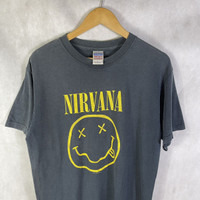 Vintage 1992 Nirvana Smiley Fades Tshirt Tag: gildan heavy cotton Sz state Medium but may fits to large Manual measurements: armpit 21 inches, top of back collar to bottom 29 inches Shoulder width 20 inches Sleeves length 8.5 inches condition: condition 8/10 , prints cracked , please zoom extra photo given main colour: black (naturally fades ) Additional: ●All Measurements were been measured flat on the floor. ●Please don't expect this item condition is 100% like new unless we have mention it. ●Please do not hesitate to contact us if you have any inquiries.Its our great pleasure to have conversation with customers. ●no return & refund if its do not meet your demand, please look carefully on details given. SHIPPING & HANDLING INFORMATION : # we shipped worldwide except ISRAEL. It's safe and you will be given tracking number for all item # we shipped items within 48 hours after receiving a cleared payment on Pay Pal (except for public holidays and weekends) and please do make sure your address is correct. # Please leave us your contact phone number, as the shipping company always need the phone number to help delivering. # we do offer combine shipping to save on postage cost. Do please contact us for combine postage after final purchases for combine shipping. Shipping cost: DHL EXPRESS : $36 (ETA 3-5 DAYS TO ARRIVE) (PLEASE REQUEST IF THE ITEM NEEDED TO BE EXPEDITED - ADDITIONAL COST REQUIRED;, UNLESS, WE USED REGISTERED MAIL SERVICE ) Thank you very much for your visit