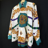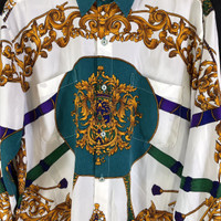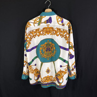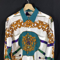 Vintage Royalty Baroque Silk Printed Button Shirt Not Hermes Celine Tag: Arsenal Caretag missing Size may fits to L-XL measurements were armpit 23.5 inches, top of back collar to bottom 29 inches, Shoulder were 18.5 inches, Shoulder to end of sleeves 22.5 inches, condition: condition 9/10 no hole , rip @ stain , (please refer photo) main colour : multicolour Additional: ●All Measurements were been measured flat on the floor. ●Please don't expect this item condition is 100% like new unless we have mention it. ●Please do not hesitate to contact us if you have any inquiries.Its our great pleasure to have conversation with customers. ●no return & refund if its do not meet your demand, please look carefully on details given. SHIPPING & HANDLING INFORMATION : # we shipped worldwide except ISRAEL. It's safe and you will be given tracking number for all item # we shipped items within 48 hours after receiving a cleared payment on Pay Pal (except for public holidays and weekends) and please do make sure your address is correct. # Please leave us your contact phone number, as the shipping company always need the phone number to help delivering. # we do offer combine shipping to save on postage cost. Do please contact us for combine postage after final purchases for combine shipping. Shipping cost: 1) DHL EXPRESS : $30 (ETA 3-5 DAYS TO ARRIVE) (PLEASE REQUEST IF THE ITEM NEEDED TO BE EXPEDITED - ADDITIONAL COST REQUIRED;, UNLESS, WE USED REGISTERED MAIL SERVICE ) 2) REGISTERED MAIL INTERNATIONAL SERVICE : $15 (ETA 14-21 DAYS TO ARRIVE) Thank you very much for your visit