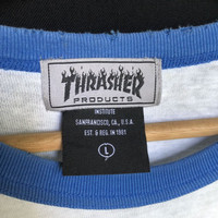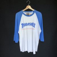 Vintage Trasher Raglan Baseball Distressed Collar Tshirt Tag: Trasher measurements were armpit 21 inches, top of back collar to bottom 28 inches, Sleeves length from collar 22.5 inches condition: good condition 7/10, got distressed near collar area, few light stain. (please refer photo) main colour : white/ blue Additional: ●All Measurements were been measured flat on the floor. ●Please don't expect this item condition is 100% like new unless we have mention it. ●Please do not hesitate to contact us if you have any inquiries.Its our great pleasure to have conversation with customers. ●no return & refund if its do not meet your demand, please look carefully on details given. SHIPPING & HANDLING INFORMATION : # we shipped worldwide except ISRAEL. It's safe and you will be given tracking number for all item # we shipped items within 48 hours after receiving a cleared payment on Pay Pal (except for public holidays and weekends) and please do make sure your address is correct. # Please leave us your contact phone number, as the shipping company always need the phone number to help delivering. # we do offer combine shipping to save on postage cost. Do please contact us for combine postage after final purchases for combine shipping. Shipping cost: 1) DHL EXPRESS : $36 (ETA 3-5 DAYS TO ARRIVE) (PLEASE REQUEST IF THE ITEM NEEDED TO BE EXPEDITED - ADDITIONAL COST REQUIRED;, UNLESS, WE USED REGISTERED MAIL SERVICE ) 2) REGISTERED MAIL INTERNATIONAL SERVICE : $15 (ETA 14-21 DAYS TO ARRIVE) Thank you very much for your visit