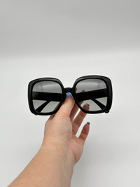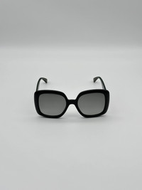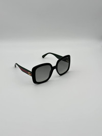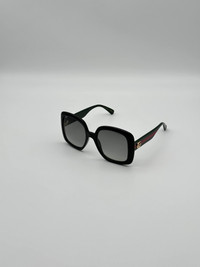 AUTHENTIC GUCCI SUNGLASSES Gucci square sunglasses in injection plastic. Eye/bridge/temple (in mm): 56-19-145. Arm length: 5.5" Gradient lenses; logo script. Web arms. Interlocking GG at temples. 100% UVA/UVB protection. May be fitted with prescription lenses. Made in Italy. Comes with original packagin