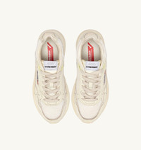 Hyperway: the Autry sneakers inspired by the future. Running style meets urban inspiration with the new Action Cush technology for maximum comfort. The upper stands out for its combination of two materials. The lightweight, breathable mesh ensures comfort, while the goatskin—known for its softness and durability—adds durability and a touch of sophistication. This combination of materials creates a monochromatic effect, giving the shoe a contemporary look that is perfect for those seeking a minimalist design. The sole features 'Action Cush' technology, delivering enhanced cushioning and optimal comfort for a uniquely smooth and enjoyable movement experience. The TPR stabilizer, strategically placed, provides support and stability. The nylon tongue adds a functional yet refined touch, while the embossed leather back counter, the jacquard fabric label at the tongue, and the side logo bring an extra layer of authenticity. SPECIFICATIONS: - Goatskin and mesh upper. - Mesh toe. - Flat cotton laces. - Jacquard logo label. - Padded collar in mesh. - Cotton terry lining. - 1.5 mm high mesh-lined sockliner. - PI sole. - Height of sole: 3.5 cm. - Personalized dust bag in nylon. COMPOSITIONS: Upper: 80%, 20% fabric (100% polyester) Lining: 50% cotton terry, 10% nylon, 5% leather, 35% mesh Sole: 40% Phylon, 20% TPU, 40% rubber