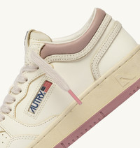 Med-Way is Autry’s new model—an evolution of the classic Medalist, distinguished by its slightly higher collar. Crafted from soft ivory white leather with branded details on the side and tongue, this women’s sneakers captures the brand’s ‘80s tennis spirit and reinterprets it with streetwear proportions for a fresh take on style and comfort. Updated with modern proportions and premium materials, it delivers maximum comfort thanks to the perforated toe designed for enhanced breathability, and the rubber sole that supports every step. Standout features include the two-tone sole with a tread matching the padded collar and refined crackle-effect leather inserts at the back, for a cutting-edge look. SPECIFICATIONS: - Upper in leather. - Micro-perforated toe. - Flat laces in cotton. - Logo label detailing seamed at the tongue. - Padded collar. - Leather and cotton terry lining. - 2 cm-high raised sockliner in leather. - Rubber sole. - Height of sole: 2.5-3.5 cm. - Personalized shoe bag in fabric. SPECIFICATIONS: Upper: 100% leather Lining: 40% leather, 50% cotton terry, 10% nylon Sole: 100% rubber