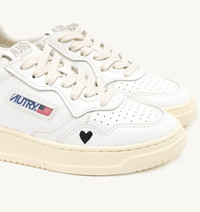 Love starts with details. Medalist in a special edition: a celebration of romance and style, straight from the heart. Crafted from white leather with black embroidered details, including the logo on the heel tab and a heart on the outer side. This design blends 1980s tennis-inspired aesthetics with premium materials and dynamic shapes, making it versatile for various looks while ensuring exceptional comfort. These sneakers stand out for their authentic style, enhanced by a jacquard logo on the side and a branded embroidered label on the tongue, adding an extra touch of personality. The micro-perforated finish on the toe ensures excellent breathability, while the slightly darker rubber sole provides comfort and keeps pace with your every step. SPECIFICATIONS: - Upper in leather. - Micro-perforated toe. - Flat cotton laces. - Embroidery label detailing seamed at the tongue. - Padded ankle collar. - Leather and cotton terry lining. - 2cm-high raised sockliner in leather. - Rubber sole. - Height of sole: 2.5-3.5 cm. - Personalize shoe bag in fabric. COMPOSITION: Upper: 100% leather Lining: 40% leather, 50% cotton terry, 10% nylon Sole: 100% rubber