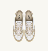A classic Medalist sneakers featuring bold color combinations that exude strong personality. This women’s style stays true to the spirit of the original Autry, inspired by 1980s tennis, while updating it with streetwear proportions for a fresh experience of style and comfort. Crafted from soft, authentic leather, it features a bold color-block design in white and beige, paired with a natural rubber sole and beige tread that complements the rhythm of your steps. SPECIFICATIONS: - Color-block leather upper. - Micro-perforated toe. - Flat laces in cotton. - Embroidery label detailing seamed at the tongue. - Padded collar. - Leather and cotton terry lining. - 2 cm-high raised sockliner in leather. - Sole in rubber with contrast tread. - Height of sole: 2.5-3.5 cm. - Personalized shoe bag in fabric. SPECIFICATIONS: Upper: 100% leather Lining: 40% leather, 50% cotton terry, 10% nylon Sole: 100% rubber
