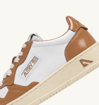 This Medalist sneakers is the quintessential everyday essential with Autry's typical attitude. The design blends 1980s tennis inspiration with premium materials and dynamic lines, making it a versatile choice that delivers great comfort. This women’s sneakers is crafted from soft, naturally textured white leather, finished with patent leather inserts color brown. Micro-perforations at the toe ensure excellent breathability and the details at the outer side and heel are adorned with the Autry logo. SPECIFICATIONS: - Upper in leather. - Micro-perforated toe. - Flat laces in cotton. - Embroidery label detailing seamed at the tongue. - Padded collar. - Leather and cotton terry lining. - 2 cm-high raised sockliner in leather. - Rubber sole. - Height of sole: 2.5-3.5 cm. - Personalized shoe bag in fabric. SPECIFICATIONS: Upper: 100% leather Lining: 40% leather, 50% cotton terry, 10% nylon Sole: 100% rubber
