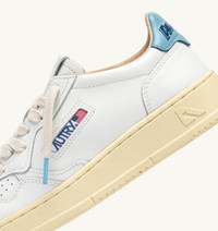 Autry Medalist reimagines 1980s tennis style, blending heritage vibes with a clean, modern aesthetic. Characterized by an essential design, it is the perfect everyday sneaker thanks to its timeless and versatile mood, ensuring everyday comfort while combining classic style and functionality. These men’s sneakers are crafted from soft, natural-looking white leather, finished with micro-perforations on the toe for excellent breathability. The light blue leather heel tab, the jacquard side detail, and the stitched label on the tongue are customized with the Autry logo for an extra touch of authenticity, while the rubber sole sets the rhythm of your steps. SPECIFICATIONS: - Upper in leather. - Micro-perforated toe. - Flat cotton laces. - Embroidery label detailing seamed at the tongue. - Padded ankle collar. - Leather and cotton terry lining. - 2 cm-high raised sockliner in leather. - Sole in rubber. - Height of sole: 2.5-3.5 cm. - Personalized shoe bag in fabric. COMPOSITION: Upper: 100% leather Lining: 40% leather, 50% cotton terry, 10% nylon Sole: 100% rubber