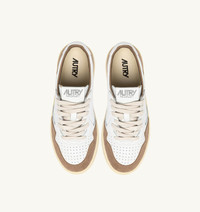 Autry Medalist reimagines 1980s tennis style, blending heritage vibes with a clean, modern aesthetic. Characterized by an essential design, it is the perfect everyday sneaker thanks to its timeless and versatile mood, ensuring everyday comfort while combining classic style and functionality. This women's sneaker is made from soft white leather with an authentic look and finished with brown suede overlays for a bold tactile and graphic mix. The leather heel detail, the tongue, and the jacquard side patch are all personalized with the Autry logo for an added touch of authenticity. SPECIFICATIONS: - Upper in suede and leather. - Micro-perforated toe. - Flat cotton laces. - Embroidery label detailing seamed at the tongue. - Padded ankle collar. - Leather and cotton terry lining. - 2 cm-high raised sockliner in leather. - Sole in rubber. - Height of sole: 2.5-3.5 cm. - Personalized shoe bag in fabric. COMPOSITION: Upper: 80% leather, 20% suede Lining: 40% leather, 50% cotton terry, 10% nylon Sole: 100% rubber