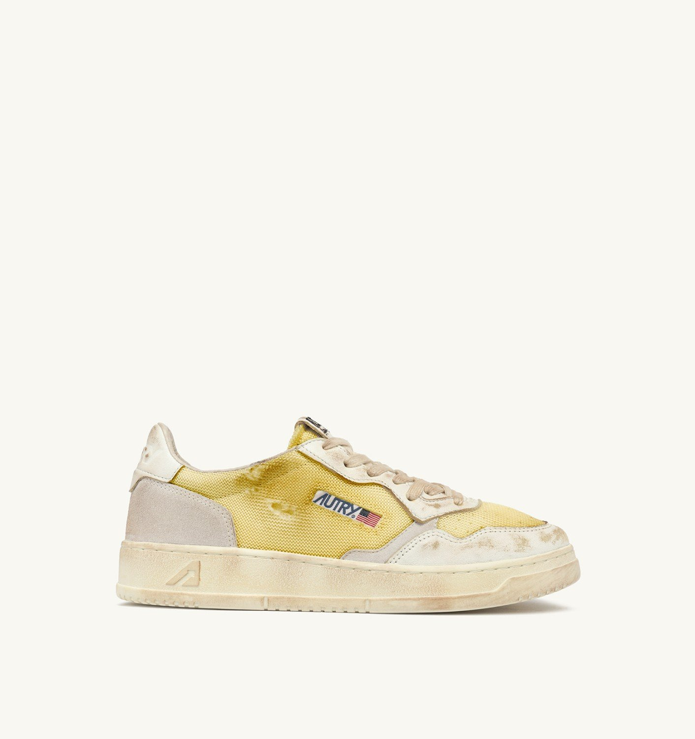 Medalist Super Vintage sneakers are the most authentic expression of Autry. This tennis-inspired design is comfortable and cozy, thanks to the high-quality materials used, while the 1980s vibe is enhanced by artisanal treatments that create a used, irregular, and unique look for each pair. These women's sneakers are crafted from ivory white mesh with a lived-in look and features goatskin and suede inserts in shades of white. The side insert draws attention to the distinctive Autry logo. The exclusive treatment used to create the vintage look is entirely Made in Italy. SPECIFICATIONS: - Upper in mesh, leather and suede. - Mesh toe. - Flat cotton laces. - Embroidery label detailing seamed at the tongue. - Padded collar. - Leather, terry and nylon lining. - 2-cm raised sockliner in leather. - Rubber sole. - Height of sole: 2.5-3.5 cm. - Personalize shoe bag in fabric. COMPOSITION: Upper: 55% mesh, 30% goatskin, 15% leather Lining: 40% leather, 50% cotton terry, 10% nylon Sole: 100% rubber