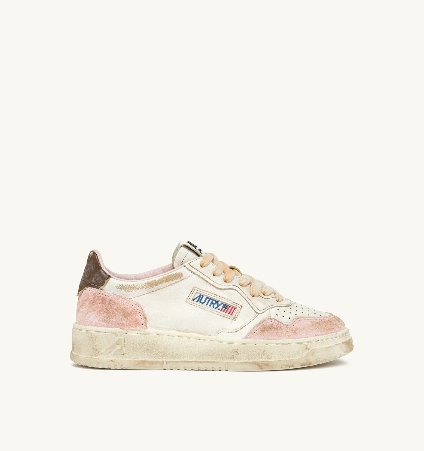 Italian artisanal expertise and Autry creativity come together to emphasize the charm of the Medalist Super Vintage style. Each style stands out for bold distressed elements which give this women's athletic shoe a truly unique look. Crafted from white leather and finished with pink suede inserts and a brown leather back patch with embossed logo. The mud-effect finish enhances both the upper and the sole. Padded ankle collar, micro-perforated toe and Autry logo detailing at side. SPECIFICATIONS: - Upper in suede and leather. - Micro-perforated toe. - Flat cotton laces. - Embroidery label detailing seamed at the tongue. - Padded collar. - Pigskin, terry and nylon lining. - 2-cm raised sockliner in leather. - Rubber sole. - Height of sole: 2.5-3.5 cm. - Personalize shoe bag in fabric. COMPOSITION: Upper: 70% leather, 30% suede Lining: 40% leather; 50% cotton terry; 10% nylon Sole: 100% rubber