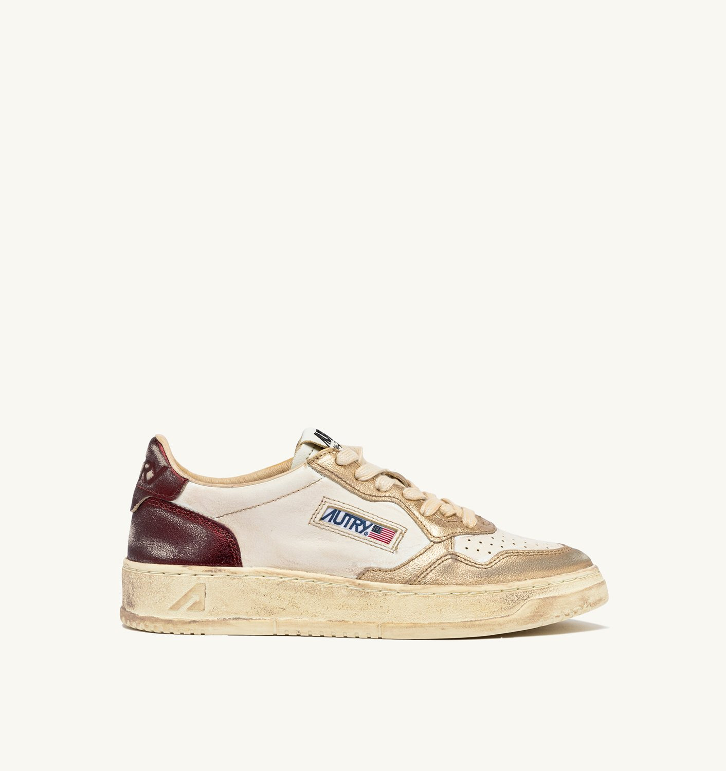 Medalist Super Vintage sneakers are the most authentic expression of Autry. This tennis-inspired design is comfortable and cozy, thanks to the high-quality materials used, while the 1980s vibe is enhanced by artisanal treatments that create a used, irregular, and unique look for each pair. These women's athletic shoes are made from soft leather with a lived-in appearance in white, metalized gold and red tones. The side insert draws attention to the distinctive Autry logo. The exclusive treatment used to create the vintage look is entirely Made in Italy. SPECIFICATIONS: - Leather upper with artisanal used treatment. - Micro-perforated toe. - Used-effect cotton laces. - Embroidery label detailing seamed at the tongue. - Padded collar. - Leather and cotton terry lining. - 2-cm raised sockliner in leather. - Rubber sole. - Height of sole: 2.5-3.5 cm. - Personalize shoe bag in fabric. COMPOSITION: Upper: 100% leather Lining: 40% leather; 50% cotton terry; 10% nylon Sole: 100% rubber