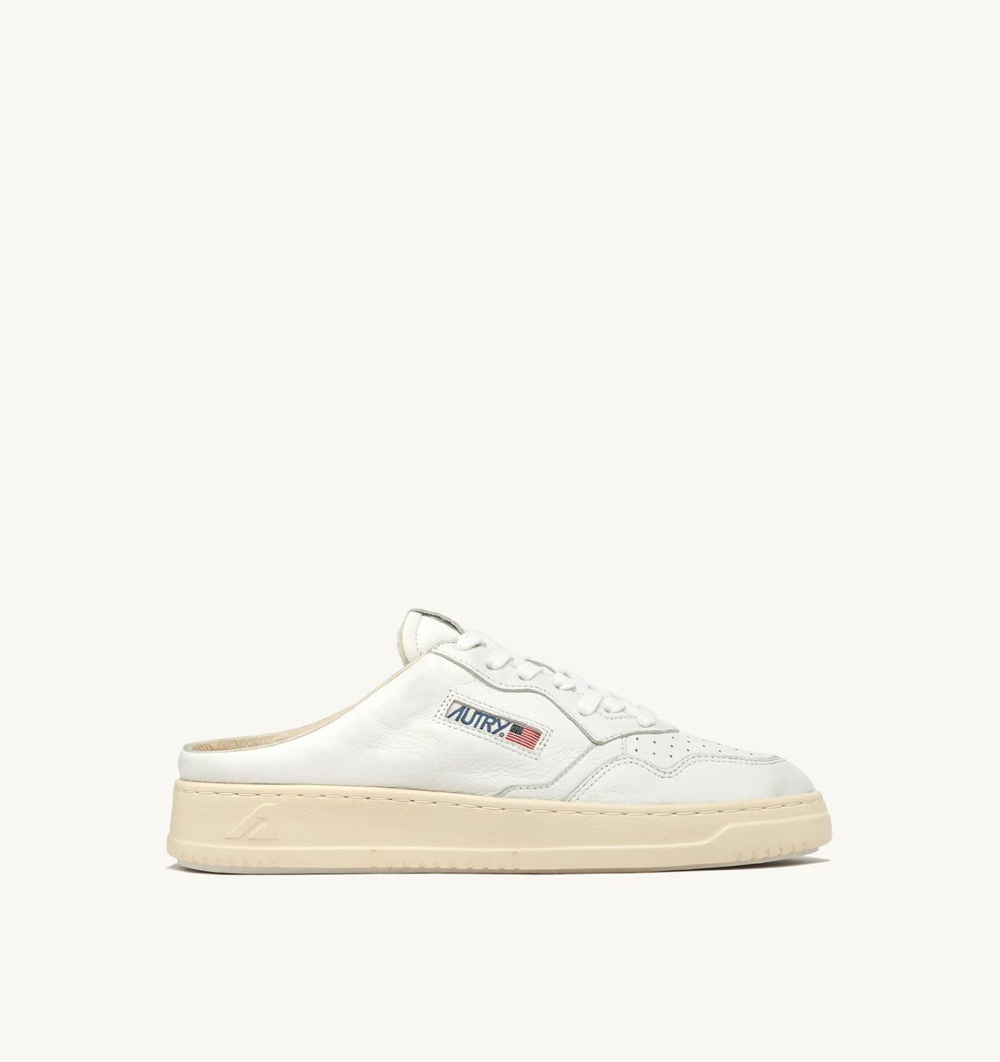 The Medalist's signature lines are reimagined in a relaxed, lightweight mule design. The women's style is crafted from white napa leather that maintains an authentic appearance, paired with a natural rubber sole. This streetwear update, featuring an exposed heel, offers an innovative style experience, while the wide upper, perforated toe, and terry lining ensure Autry's distinctive comfort. The light worn effect of the Autry napa leather mules is achieved through a stonewashing treatment, a process applied to each individual shoe, resulting in a look that may intentionally feature creases and uneven coloration. SPECIFICATIONS: - Super-soft napa leather upper. - Micro-perforated toe. - Flat cotton laces. - Embroidery label detailing seamed at the tongue. - Leather and cotton terry lining. - 2-cm raised sockliner in leather. - Rubber sole. - Height of sole: 2.5-3.5 cm. - Personalize shoe bag in fabric. COMPOSITION: Upper: 100% goatskin Lining: 40% leather, 50% cotton terry, 10% nylon Sole: 100% Phylon with TPU base