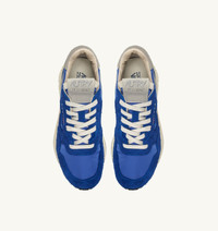 Innovative, lightweight, and remarkably flexible, Reelwind is the Autry sneakers inspired by running styles. This women's sneakers is designed for an active lifestyle, combining blue suede and nylon with white leather accents on the sides. The sleek profile and performance construction ensure maximum freedom of movement, while the Rubber sole, featuring a raised tread, is detailed with a star motif and the trademark "A-arrow" – a modern and graphic reinterpretation of the Autry logo. SPECIFICATIONS: - Leather, nylon and suede upper - Flat cotton laces - Label sewn on tongue - Padded ankle collar - Lined in leather, nylon and cotton terry - 2 cm leather insole - Running sole - Height of sole: 2.5-3.5 cm. - Personalize shoe bag in fabric. COMPOSITION: Upper: 60% nylon, 40% leather Lining: 40% leather, 50% cotton terry, 10% nylon Sole: 60% Phylon, 40% Rubber