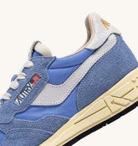 Sporty performance and metropolitan lifestyle. The women’s Reelwind sneakers explores street dynamism with a panel construction that combines nylon and suede in color matching azure tones, accented with crackle-effect white leather inserts. The mix of colors and textures adds contrast to the clean, lightweight profile, resting on a white Phylon running sole that provides flexibility and grip with every step. Notable details include the 3D star pattern and the distinctive A-arrow, paying tribute to the brand's spirit. SPECIFICATIONS: - Upper in nylon, suede, and leather. - Flat laces in cotton. - Label sewn on tongue. - Padded collar. - Leather and cotton terry lining. - 2 cm-high raised sockliner in leather. - Rubber sole. - Height of sole: 2.5-3.5 cm. - Personalized shoe bag in fabric. SPECIFICATIONS: Upper: 20% crackle-effect leather, 35% suede, 45% nylon Lining: 40% leather, 50% cotton terry, 10% nylon Sole: 60% Phylon, 40% Rubber