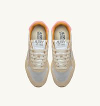 Reelwind sneakers offer the technical edge of a performance shoe with the unmistakable style of the Autry aesthetic. This women's athletic shoe is crafted from reflective gray nylon in silver tones and is reinforced by beige suede and gold-tone metalized leather inserts that create a dynamic design. Lightweight and streamlined, it is completed by a rubber and Phylon running sole that softens the impact on the road or on the pitch. SPECIFICATIONS: - Upper in leather, suede, nylon and mesh. - Mesh toe. - Flat cotton laces. - Embroidery label detailing seamed at the tongue. - Padded collar. - Leather, terry and nylon lining. - 2-cm raised sockliner in leather. - Rubber sole. - Height of sole: 2.5-3.5 cm. - Personalize shoe bag in fabric. COMPOSITION: Upper Material: 10% cracked cow leather, 30% suede, 5% cow leather, 40% nylon, 15% mesh Lining: 40% leather, 50% cotton terry, 10% nylon Sole: 60% Phylon, 40% rubber