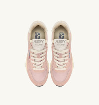 Innovative, light and extremely flexible, Reelwind Autry sneakers draw inspiration from the running world. The women's style is crafted from a mix of pink nylon and suede, with side panels in white crackle-effect leather. Designed for a dynamic lifestyle, it features a slender silhouette and performance construction that ensures maximum freedom of movement. The Rubber sole with an embossed tread is personalized with a star pattern and an A-arrow that offers a graphic and modern reinterpretation of the logo. SPECIFICATIONS: - Upper in leather, nylon and suede. - Flat cotton laces. - Label sewn on tongue. - Padded collar. - Nylon, leather and cotton terry lining. - 2-cm raised sockliner in leather. - Running outsole. - Height of sole: 2.5-3.5 cm. - Personalize shoe bag in fabric. COMPOSITION: Upper: 60% nylon, 40% leather Lining: 40% leather, 50% cotton terry, 10% nylon Sole: 60% Phylon, 40% Rubber