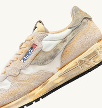 Innovative, light, and extremely flexible, Reelwind draws inspiration from the running world, enhanced by artisanal treatments that give each style a distinct, irregular, and unique used appearance. The women's style is crafted from a mix of white nylon and long hair suede, with side panels in gray crackle-effect leather. Designed for a dynamic lifestyle, it features a slender silhouette and performance construction that ensures maximum freedom of movement. The rubber sole with an embossed tread is personalized with a star pattern and an A-arrow that offers a graphic and modern reinterpretation of the logo. The exclusive treatment used to create the vintage look is entirely Made in Italy. SPECIFICATIONS: - Upper in crackle-effect leather, nylon and long hair suede. - Flat cotton laces. - Label detailing at tongue. - Padded collar. - Nylon, leather and cotton terry lining. - 2-cm raised sockliner in leather. - Running outsole in rubber sole with relief logo. - Height of sole: 2.5-3.5 cm. - Personalize shoe bag in fabric. COMPOSITION: Upper: 60% nylon, 40% leather Lining: 40% leather, 50% cotton terry, 10% nylon Sole: 60% Phylon, 40% rubber