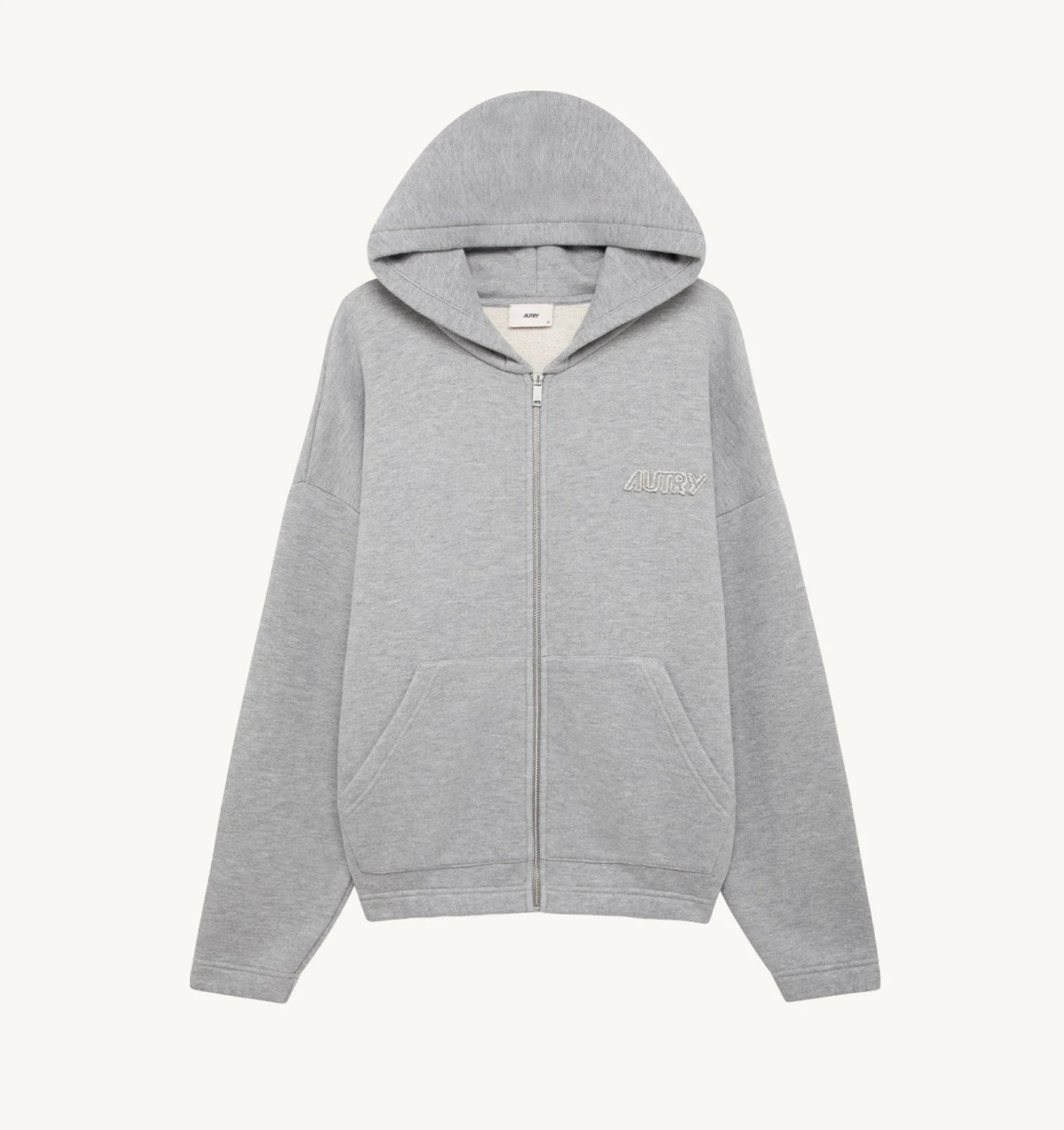 DETAILS: - 85% cotton 15% polyester - Unisex - Hooded sweatshirt with full zip - Elasticated bottom and cuffs - Kangaroo pocket - Autry embroidery logo patch at chest - Loose fit - Non-brushed sweatshirt The model is 1.86 m tall and wears size L. The model is 1.77 m tall and wears size M.
