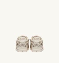 Windspin sneakers bloom with floral charm in a version that blends elegance and femininity. Its sleek silhouette and flat, dynamic profile embody Autry’s signature mix of vintage appeal and modern style. The ultra-flat rubber sole ensures excellent grip on all urban surfaces. This unique version is crafted from leather with floral details accented by metallic studs that add shine and depth. Each flower is carefully applied by hand and finished with meticulous attention to detail, creating a lively yet refined design. Available in four exclusive pastel colorways, it’s a delicate choice perfect even for special occasions. SPECIFICATIONS: - Upper in leather. - Lurex logo detailing at side. - Flat cotton laces. - Lightly padded tongue in nylon with jacquard logo label. - Padded ankle collar. - Leather and cotton terry lining. - 0.8 mm high mesh-lined sockliner. - Rubber sole. - Height of sole: 1-1.7 cm. - Personalized shoe bag in fabric. COMPOSITION: Upper: 100% leather Lining: 30% leather, 65% cotton terry, 5% nylon Sole: 100% rubber