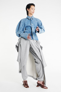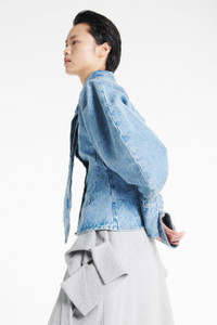 Crafted from midweight denim, this voluminous shirt is designed with a classic collar and detachable matching tie. Puffy sleeves with wide cuffs add structure, while a fitted waistline shapes the silhouette. Shown here with Jersey Jogger With Shirt Skirt Grey Melange. FIT & SIZE - Designed with a slim fit at the waist. - True to size, we recommend choosing your regular size. - Model is 177 cm / 5'9" (bust: 75 cm / 29”, waist: 60 cm / 23”, hips: 88 cm / 34”) and is wearing a size FR 34. PRODUCT DETAILS - 100% Cotton - Press studs. - Unlined. - Dry clean. - Made in Portugal.