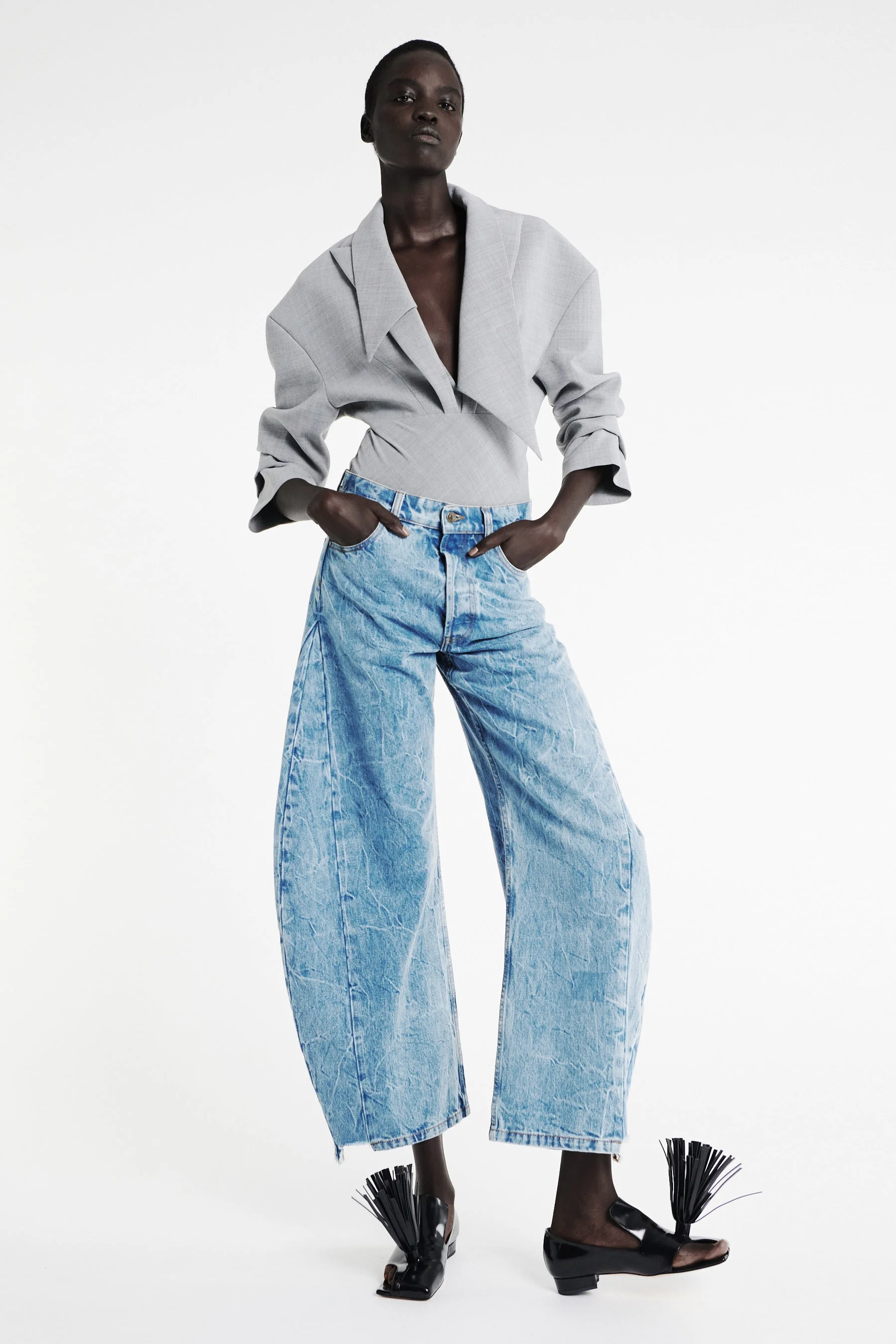 Cut in a curved, barrel silhouette, these high-waisted denim jeans offer a relaxed shape that sits cleanly at the waist. The sculpted leg introduces volume without heaviness, while the overall line remains precise and architectural. Shown here with Tailored Bodysuit With Shirt Collar Insert Grey Melange. Available in white, ecru and washed black. FIT & SIZE - Designed with a high waist and regular fit. - True to size, we recommend choosing your regular size. - Model is 181 cm / 5'11" (bust: 74 cm / 29”, waist: 61 cm / 24”, hips: 87 cm / 34½”) and is wearing size FR 34. PRODUCT DETAILS - 100% Cotton - Midweight material. - Button closure. - Dry clean. - Made in Portugal.