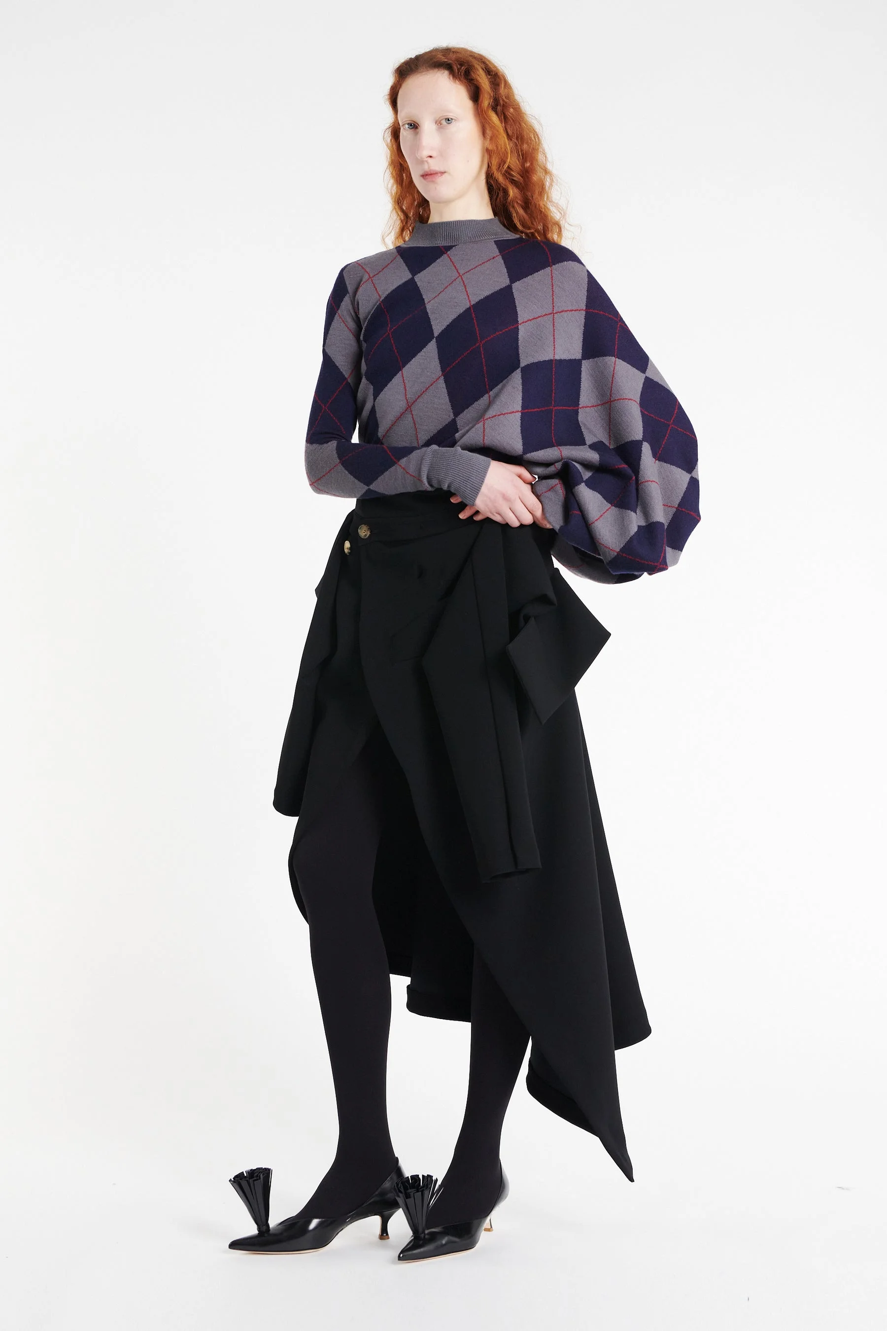Crafted from extra-fine merino wool in an argyle pattern, this asymmetric sweater features a funnel neck and gentle draping that contours the body. A versatile layer, it pairs effortlessly with both structured tailoring and relaxed proportions. Shown here with Shirt-Skirt Black and Lea Black. FIT & SIZE - Designed with a relaxed fit at the bust and a slim fit at the waist. - True to size, we recommend choosing your regular size. - Model is 181 cm / 5'9" (bust: 81 cm / 31”, waist: 61 cm / 24”, hips: 89 cm / 35”) and is wearing a size XS. PRODUCT DETAILS - 100% Merino Wool - Heavyweight material. - Pull-on. - Unlined. - Dry clean. - Made in Italy.