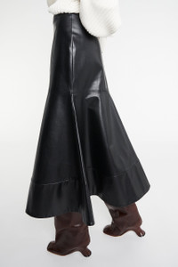 Crafted from heavyweight faux leather, this midi skirt features a high waist and a dramatic flared hem. Set with a hidden back zip for a smooth finish, the sculptural silhouette brings structured movement to classic form. Shown here with Heavy Sweater Rib With Buttons Ivory and Christy Boot Brown. FIT & SIZE - Designed with a high waist. - True to size, we recommend choosing your regular size. - Model is 181 cm / 5'11" (bust: 74 cm / 29”, waist: 61 cm / 24”, hips: 87 cm / 34½”) and is wearing size FR 34. PRODUCT DETAILS - Upper: 51% Polyester 49% Alifatic Resin Solventless Base: 100% Polyester - Heavyweight material. - Zip fly. - Unlined. - Dry clean. - Made in Lithuania.